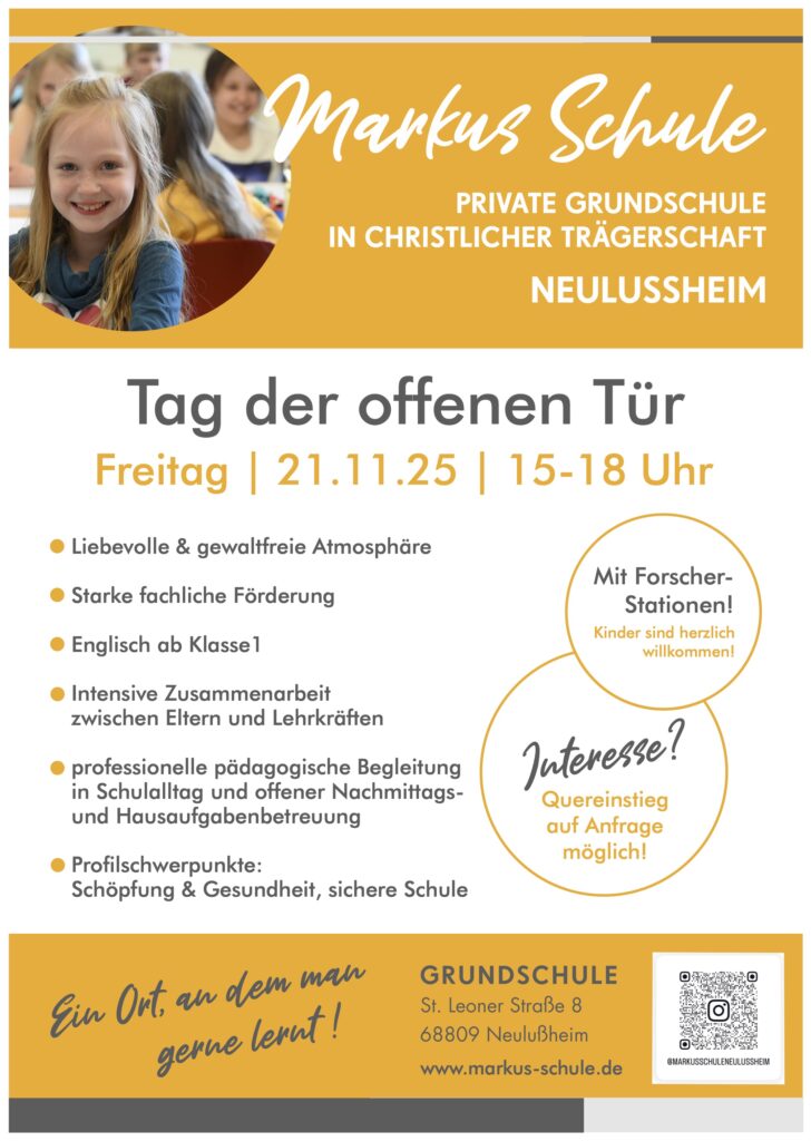 Die Markus-Schule ist eine christliche Privatschule im Herzen Nordbadens. Uns ist es wichtig allen Kindern eine Schulzeit zu ermöglichen, in der sie eine fundierte Grundschulbildung in einer liebevollen Atmosphäre erleben können. Unser Schulmotto Ein Ort, an dem man gerne lernt ist in vielen Bereichen unserer Schulgemeinschaft spürbar.