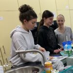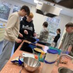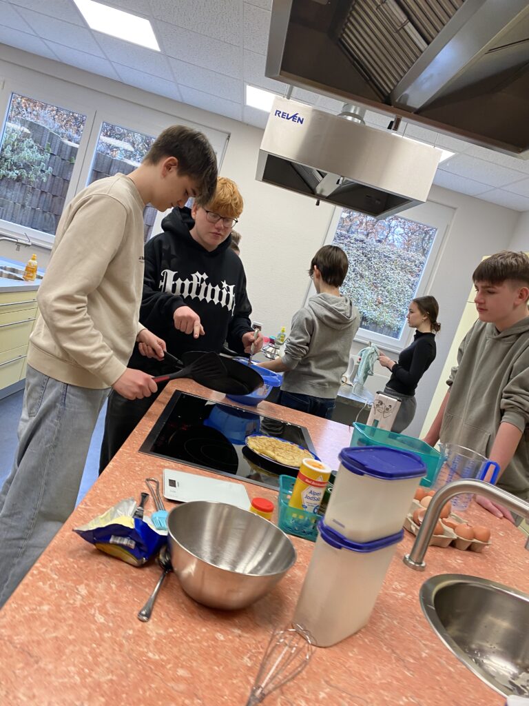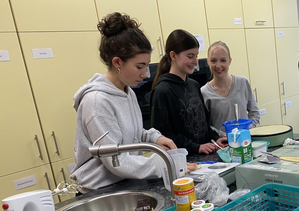 Französischgruppe der Klassen 9a und 9b: Heute mal zur Abwechslung keine Verbkonjugation im Klassenzimmer, sondern Zubereitung leckerer Crêpes in der Schulküche.