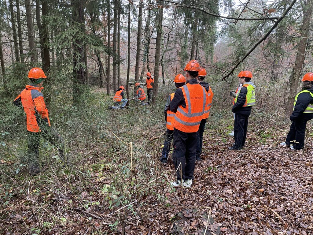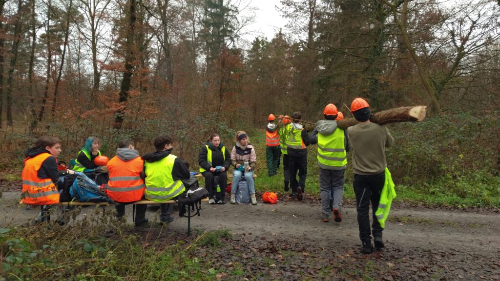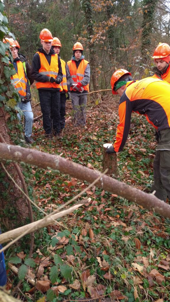 Beim Abtransport der Baumstämme war Teamarbeit gefragt. Hier zeigte sich, wer Verantwortung übernimmt und auf seine Mitschüler achtet. Ein besonderer Dank gilt Lukas Stange, der mit seiner wertschätzenden Art den Rahmen für dieses praxisnahe Lernen schuf. Zusätzlich informierte er die Jugendlichen über Ausbildungs- und Studienmöglichkeiten in der Forstwirtschaft und lud sie zu Praktika bei ForstBW ein.