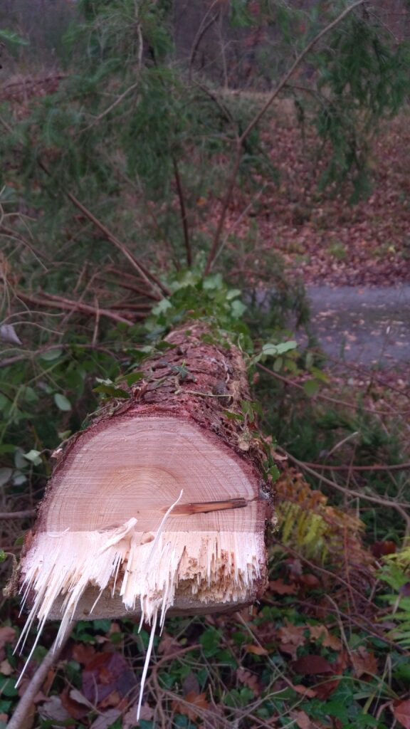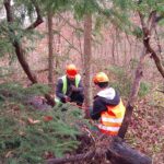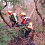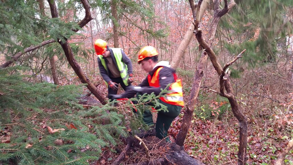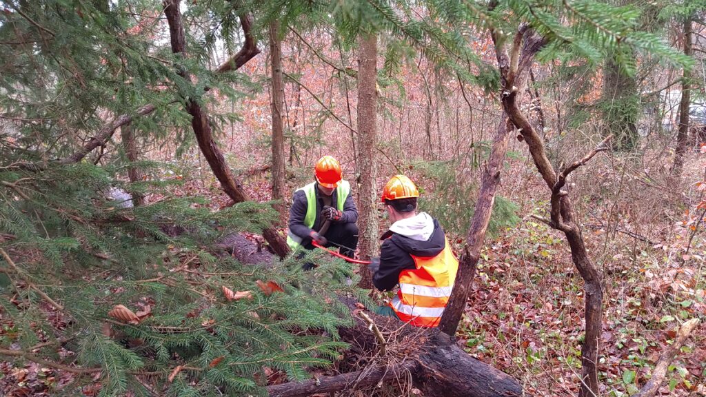 Unter der fachkundigen Anleitung von Waldpädagoge Lukas Stange und seinem Praktikanten Michael (Student der Forstwirtschaft) erhielten die Jugendlichen spannende Einblicke in die Arbeit der Forstwirtschaft. Dabei stand das praktische Arbeiten im Vordergrund: Die Schülerinnen und Schüler durften selbst Fichten mit einem Brusthöhendurchmesser von maximal 20 cm fällen, entasten und schälen. Sie lernten die richtige Fälltechnik, den sicheren Umgang mit Werkzeugen wie Ziehklinge, Kluppe, Baumsäge und Astsäge sowie wichtige Sicherheitsaspekte – inklusive der typischen Rufe „Achtung!“ und „Baum fällt!“.